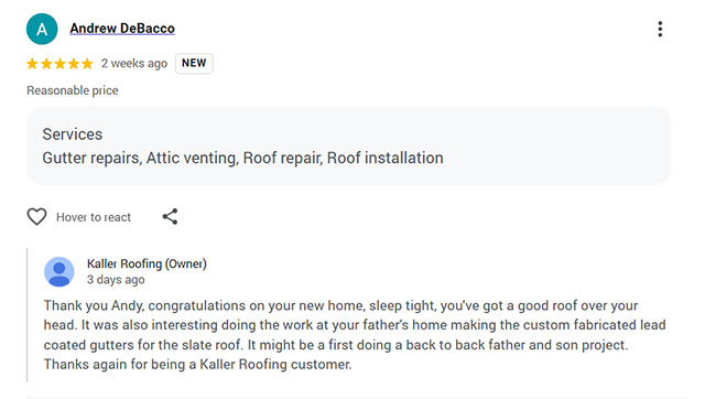 Kaller Roofing was glad to provide a custom fabrication of lead coated copper flange gutter for a slate roof restoration project and appreciated the 5 star review from Andy B on this roofing and exterior home improvement project in Villanova, Pennsylvania.
