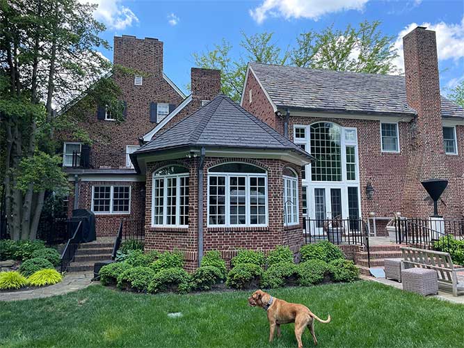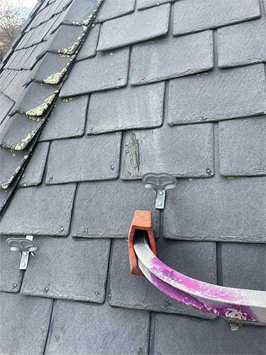 The roof of the front addition on this beautiful brick home did not match up with the original quality slate roof on the main house. Someone had used a fake slate made of plastic that was quickly deteriorating.