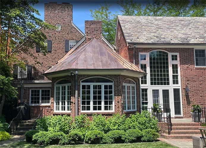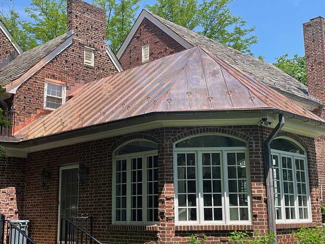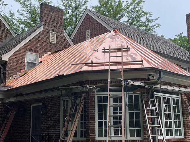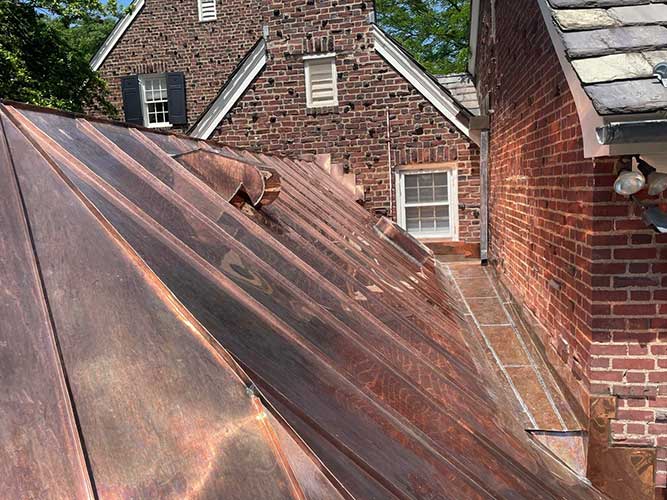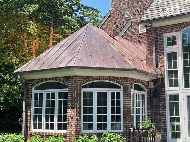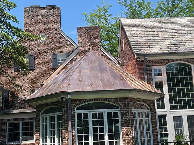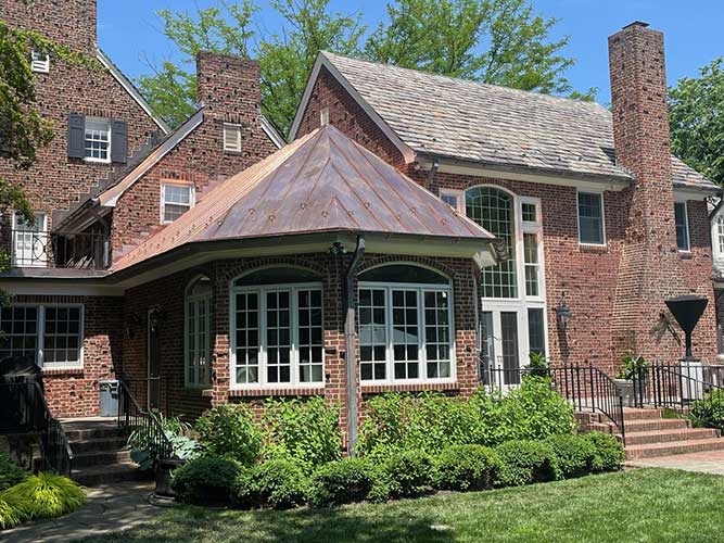 The Kaller Roofing team went to work on removing the poor-quality roofing on the addition, ensuring the base of the roof would be solid going forward and installing a copper roof to better complement and enhance the overall look of this home.